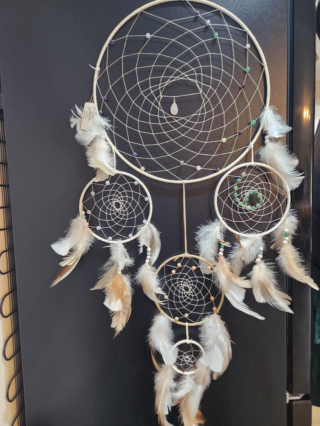 5 Ring Dreamcatcher with Rose Quartz, Howlite, Amethyst, Moonstone, Garnet, Aquamarine, Aventurine and Lapis Lazuli crystals sewn into the web. Approx 48" long x 14" wide