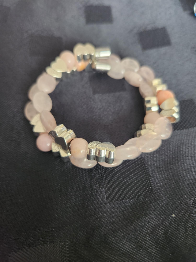 DOUBLE HEART DOUBLE ROSE QUARTZ & PINK OPAL BANGLE