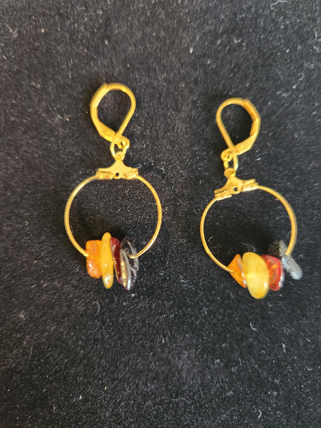 Four coloured Amber hoop earrings set in gold coloured setting with a drop of 2"